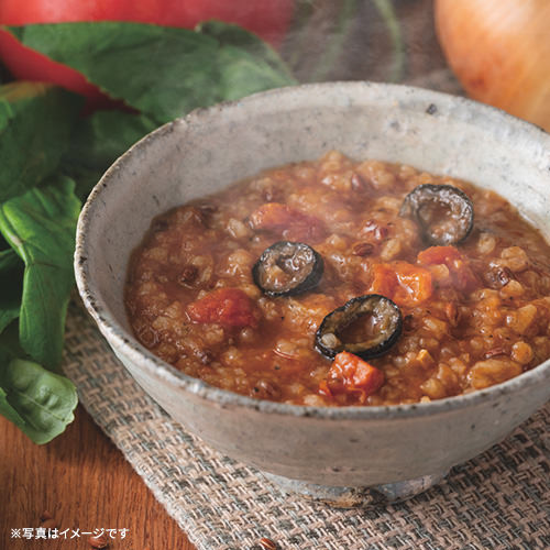 赤米とブラックオリーブの色合いが楽しめる、トマトの美味しいお粥。