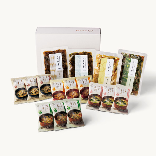 - 四季をいただくお味噌汁[三種きのこと赤味噌]:なめこ(国産)、米みそ(大豆を含む)、ぶなしめじ、えのき茸、ねぎ、デキストリン、かつおだし、昆布エキス、でん粉、食塩、酵母エキス、砂糖/酸化防止剤(V.E)