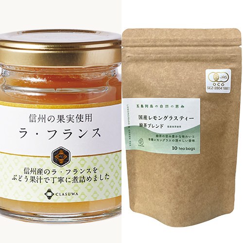 - 国産レモングラスティー[緑茶ブレンド]:有機緑茶(長崎県五島市)、有機レモングラス、抹茶