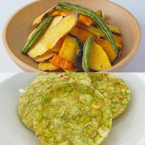 - 彩り野菜チップス[うす塩味]:野菜チップス(さつまいも、かぼちゃ、じゃがいも、インゲン、ニンジン、マルトース、植物油、食塩)